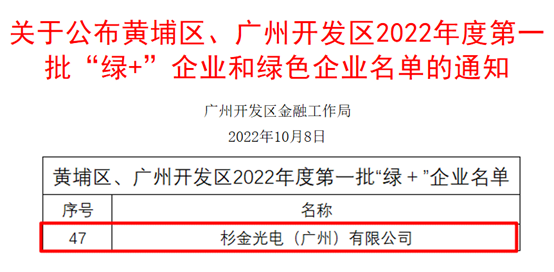 近日,根據(jù)《關(guān)于印發(fā)廣州市黃埔區(qū) 廣州開發(fā)區(qū)綠色項(xiàng)目、綠色企業(yè)認(rèn)定管理辦法(試行)的通知》(穗開金融規(guī)字〔2020〕4號)文件要求,經(jīng)企業(yè)申報(bào),第三方認(rèn)證機(jī)構(gòu)評審、認(rèn)定,廣州開發(fā)區(qū)金融工作局受理、審查、公示等程序,杉金廣州成功入選黃埔區(qū)、廣州開發(fā)區(qū)2022年度第一批“綠+”企業(yè)。