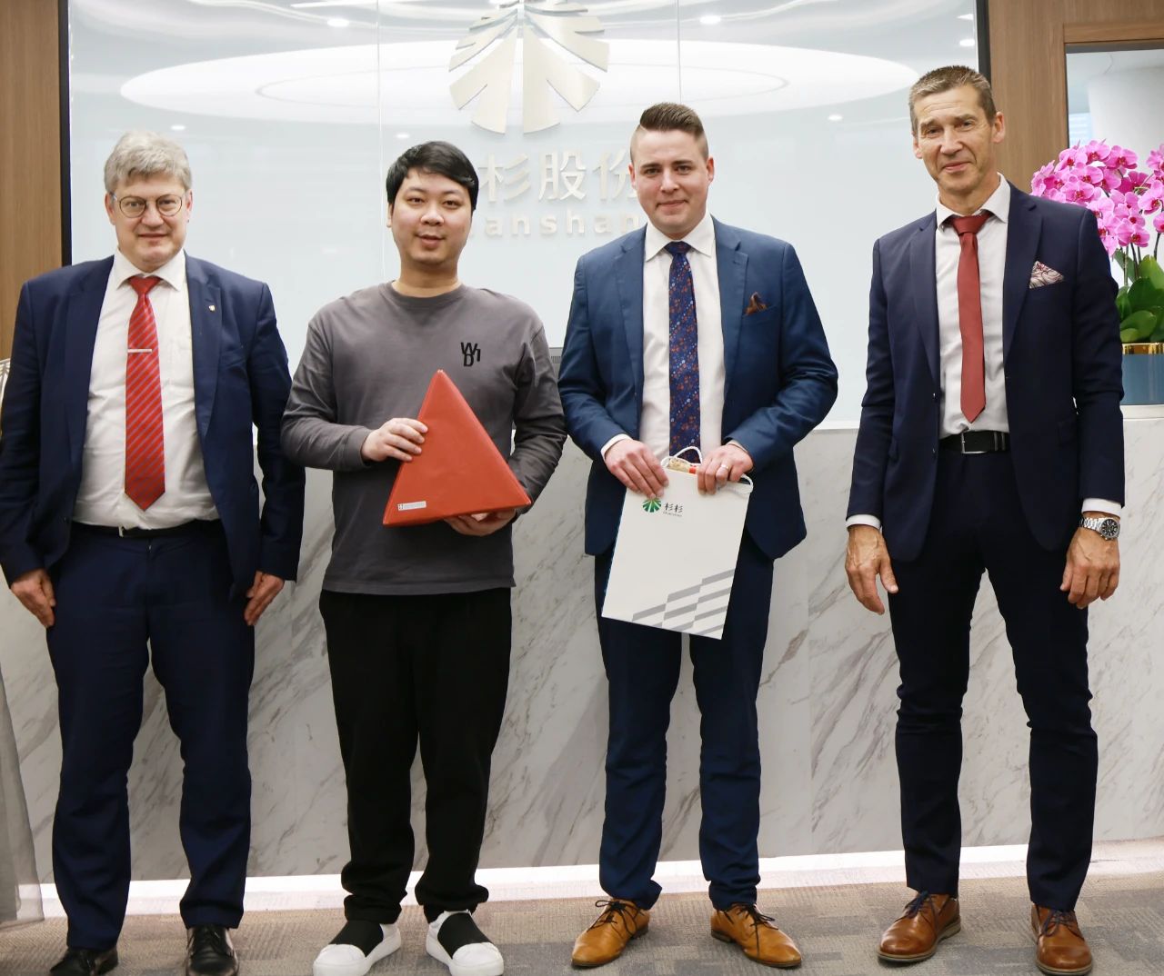 有朋自遠方來 芬蘭科斯霍爾姆市市長一行到訪杉杉 2024年04月19日 4月19日,芬蘭科斯霍爾姆市議會主席Christoffer Ingo、市長Rurik Ahlberg、技術總監Ben Antell及芬蘭投資署成員一行蒞臨杉杉